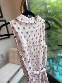 DETAILS: Sleeveless midi shines with its intricate floral dot pattern. Shirt silhouette. Complete with a sophisticated collar neckline. Exudes timeless elegance. Fabric tie waist accentuates your figure. Button closure. Organic cotton.