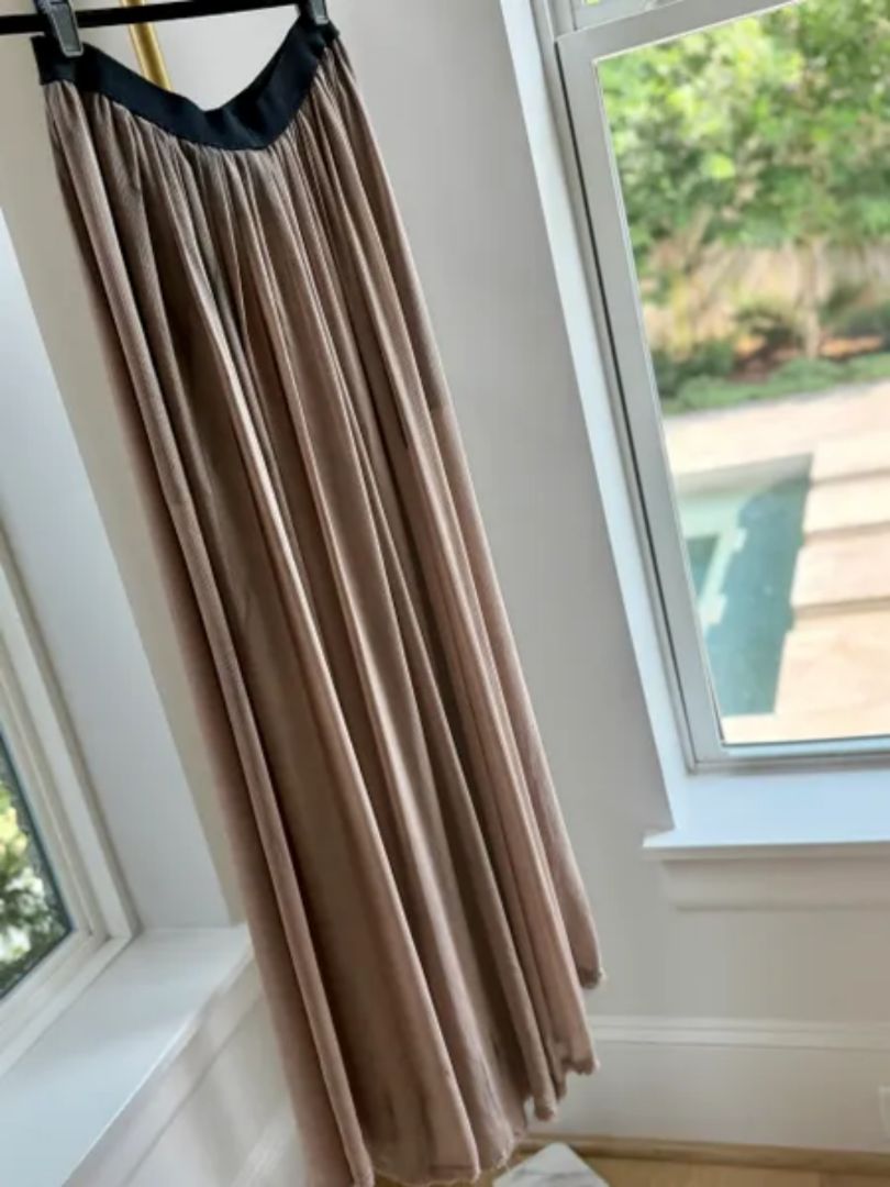 DETAILS: A Flowing Taupe Maxi Skirt Crafted from a Lightweight, Semi-Sheer Fabric. The Skirt Features Delicate Pleats That Create a Graceful Drape. It Has a Comfortable Elastic Waistband with a Thin Black Band for Added Detail and Contrast.