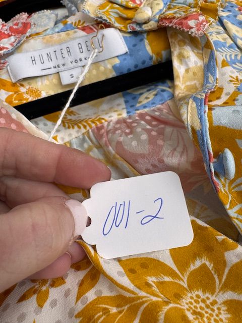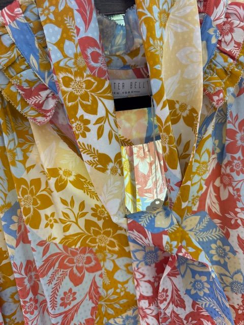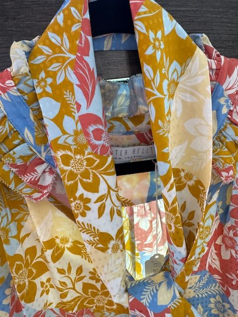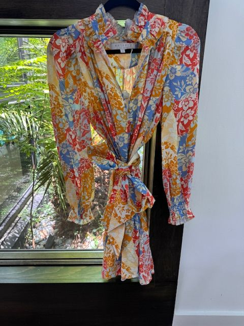 High neck long sleeve silk mini dress - Long blouson sleeves with elastic cuffs - Self-tie sash (completely removable, no belt loops) - Ruffle mock neck detail with keyhole & button down placket - Drop waist seam creates an elevated silhouette - Slip liner in cream with adjustable cami straps (also fully removable) - 100% silk - Light weight, non-stretch jacquard - Colorful floral patch work print in yellow, coral red, blue, & ivory Approx. measurements laying flat: 24" pit to pit, 35" shoulder to bottom length