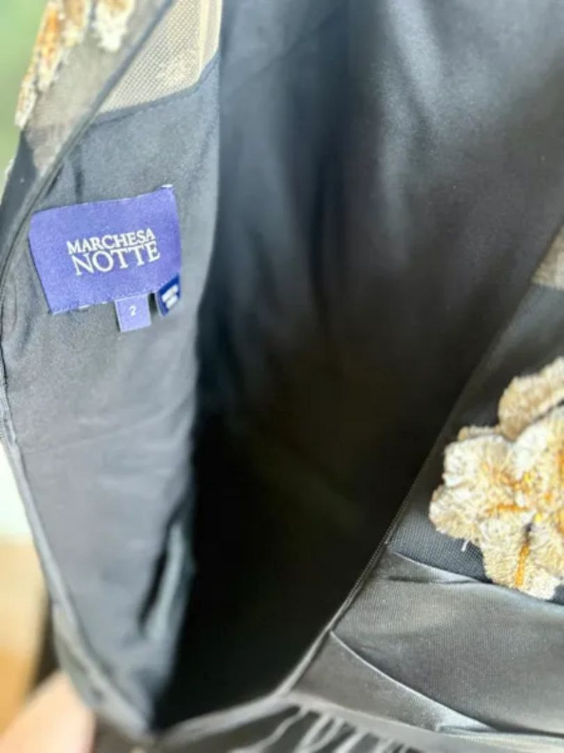 DETAILS: Long Silk Gown Embroidered with Gold Flowers On Sheer- Short Sleeves. Back Closure Zipper. Pleated Full Skirt.